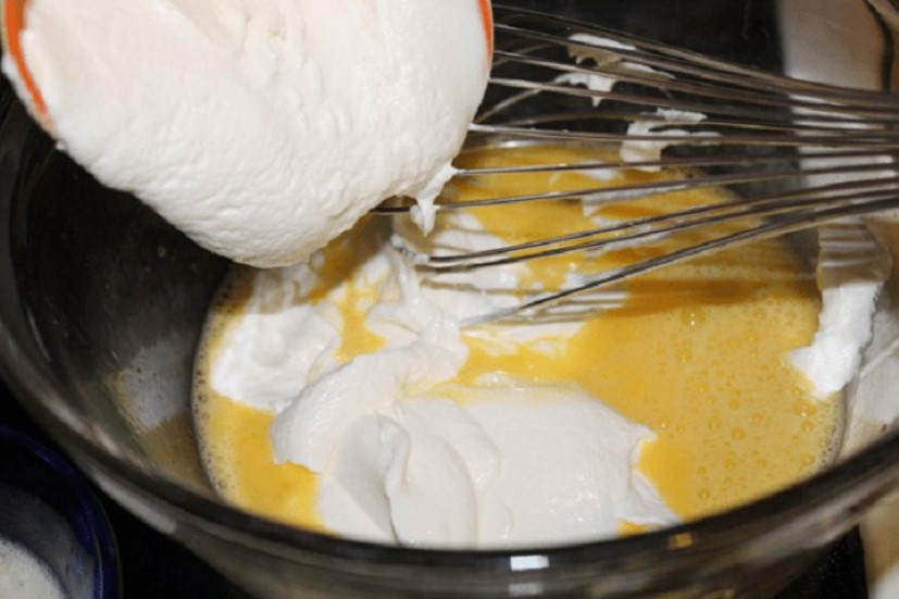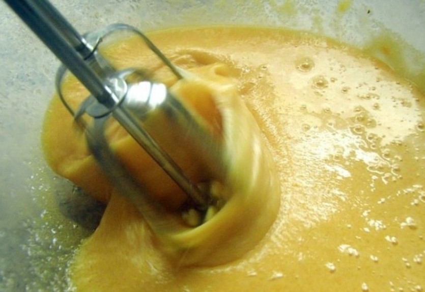 Jajka i cukier ubić razem w misce, aż będą puszyste. Ważne jest, aby cukier całkowicie się rozpuścił.