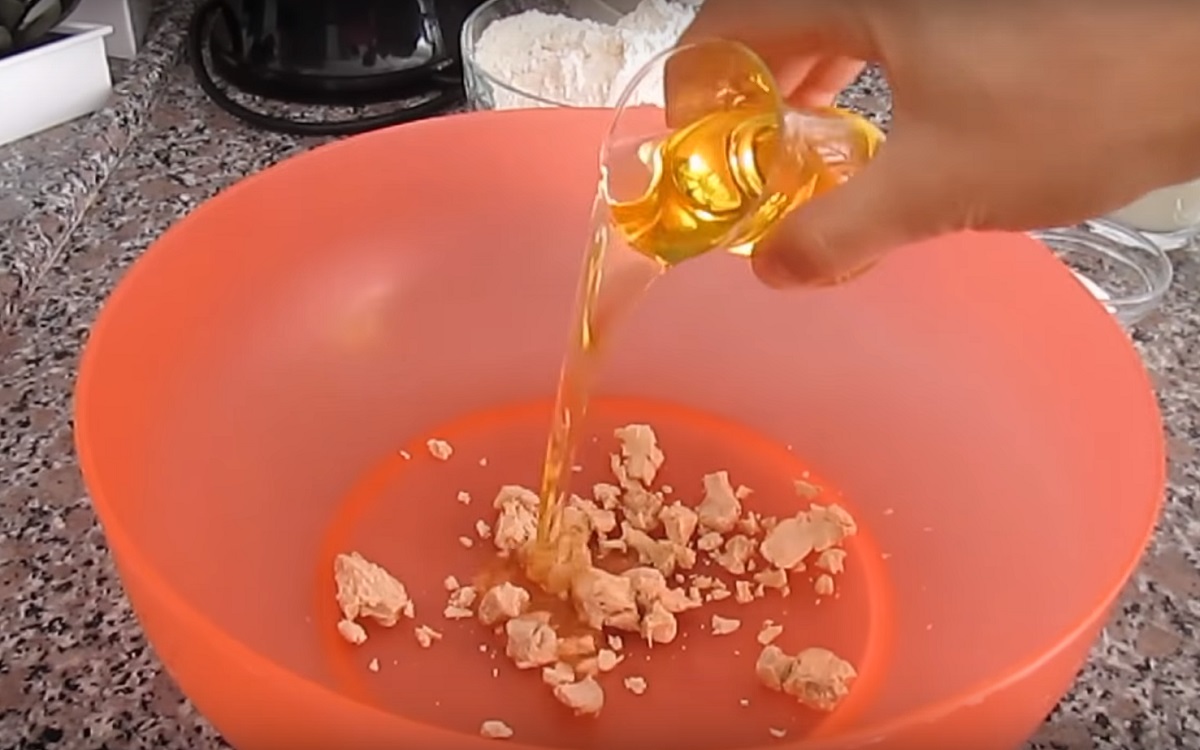 Pierwszym krokiem jest pokruszenie drożdży oraz wymieszanie ich w dużej misce z 150 ml oleju roślinnego. Do miski dodajemy również mleko oraz sól. Dokładnie mieszamy, pobudzając drożdże do pracy.