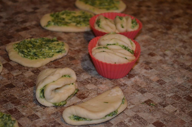 Aby to uczynić przygotuj masło. Musi być miękkie, ale nie rozpuszczone. Do masła przeciśnij przez praskę czosnek i dodaj ulubione zioła. Wszystko wymieszaj. Z wcześniej zagniecionego ciasta rozwałkuj niewielkie krążki. Następnie posmaruj całość przygotowaną pastą z masła, czosnku i ziół. Posmarowane kółko złóż na pół i jeszcze raz na pół i jeśli się da – kolejny raz na pół.