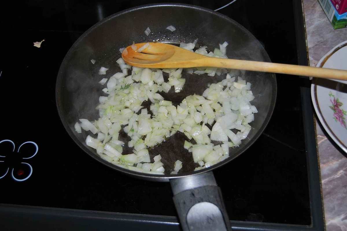 W tym czasie przygotowujemy farsz. Zaczynamy od ugotowania piersi z kurczaka oraz obrania i posiekania cebuli. Cebulę należy podsmażyć na maśle, aż będzie miękka. Ugotowany filet zmielić, np. w blenderze.