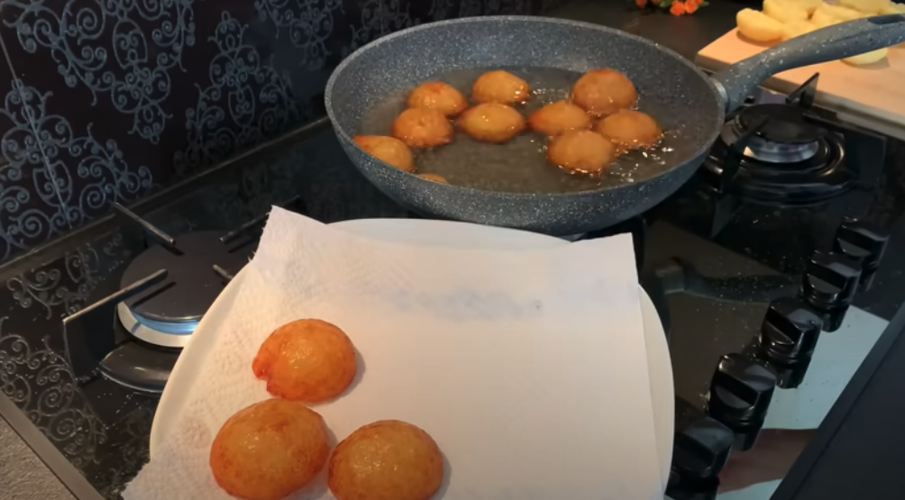 Uformuj z każdej części placki lub kulki, według uznania. Rozgrzej olej roślinny na patelni. Smaż placki lub kulki ziemniaczane na średnim ogniu, aż będą złociste i chrupiące z każdej strony. Odłóż na papierowy ręcznik, aby odsączyć nadmiar oleju. Podawaj na ciepło.