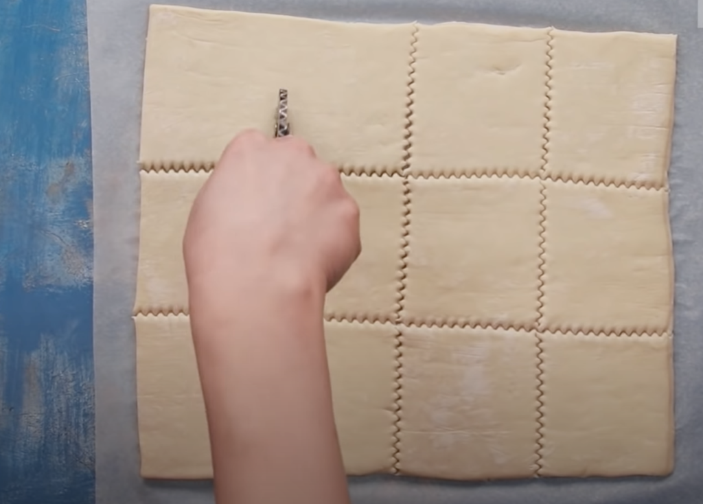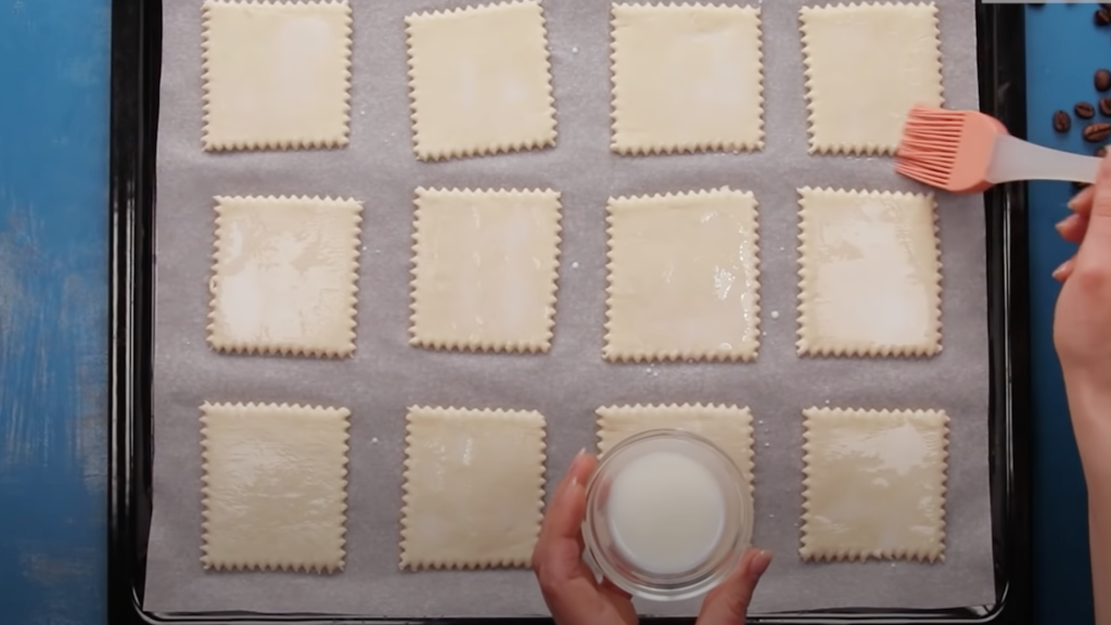 Ułóż ciasto na blasze wyłożonej papierem do pieczenia i posmaruj wierzch mlekiem.