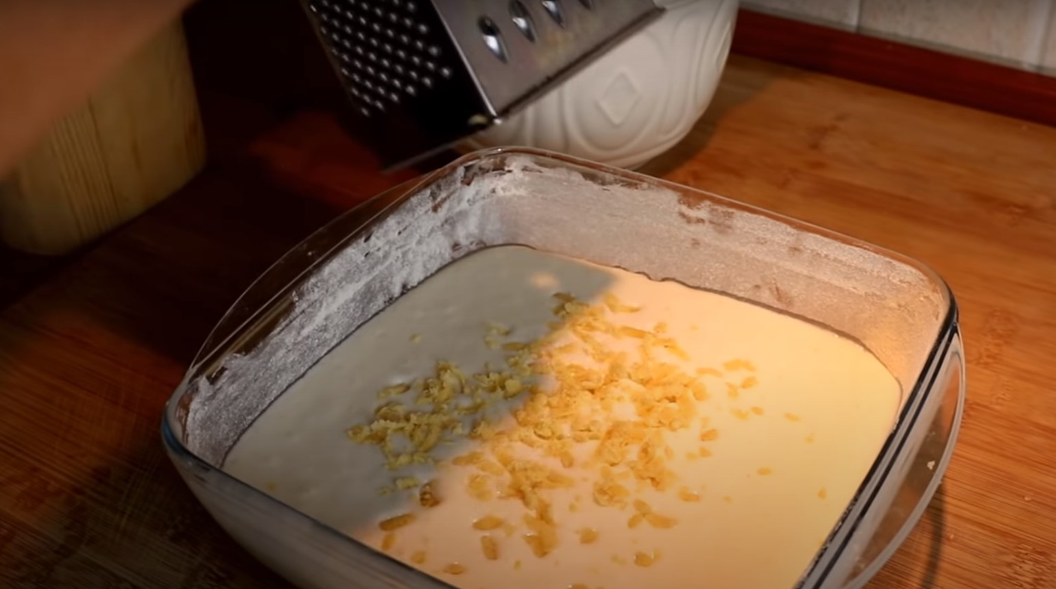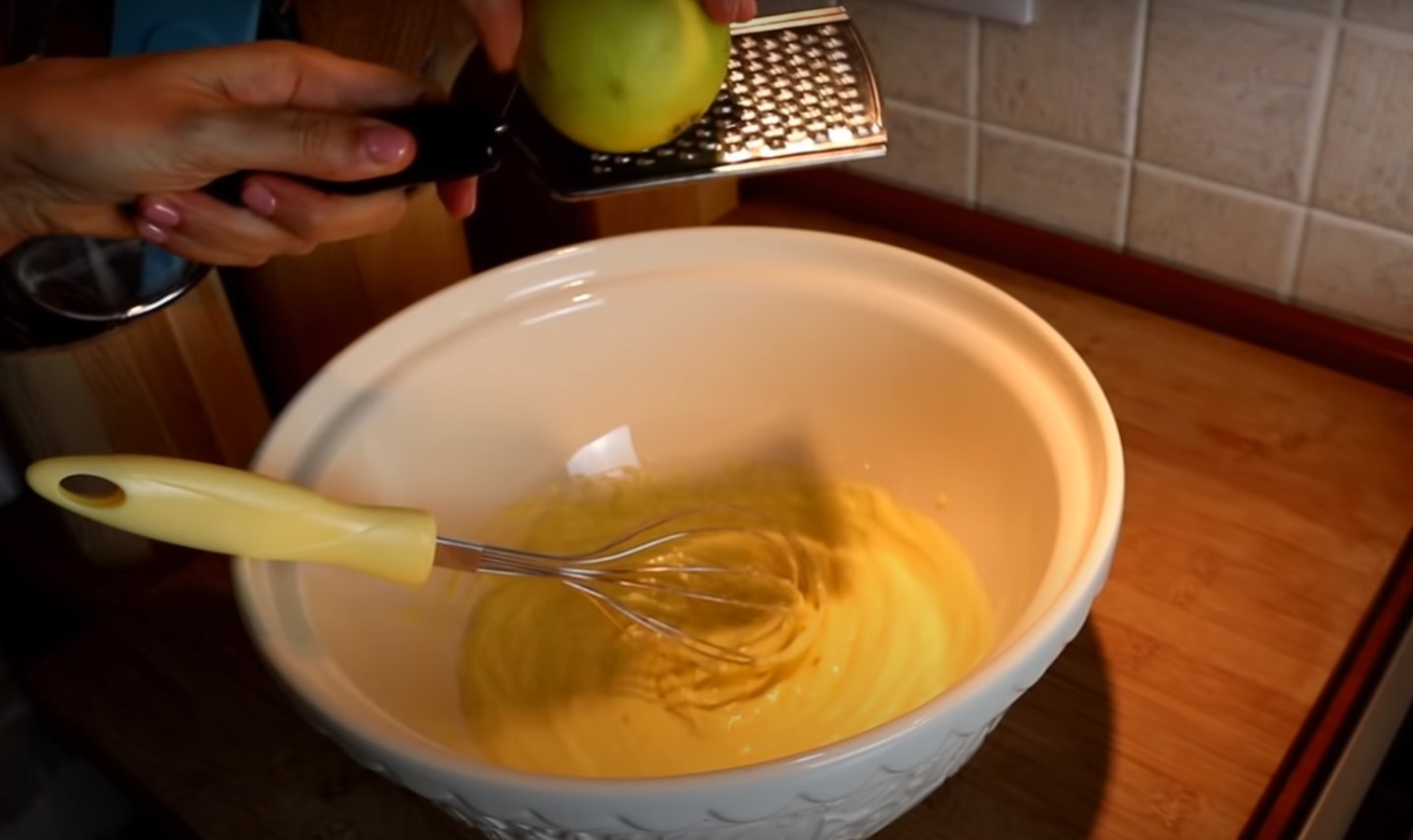 Włóż żółtka do miski, dodaj cukier i wymieszaj. Dodaj roztopione masło i ponownie wymieszaj. Teraz dodajemy skórkę z cytryny.