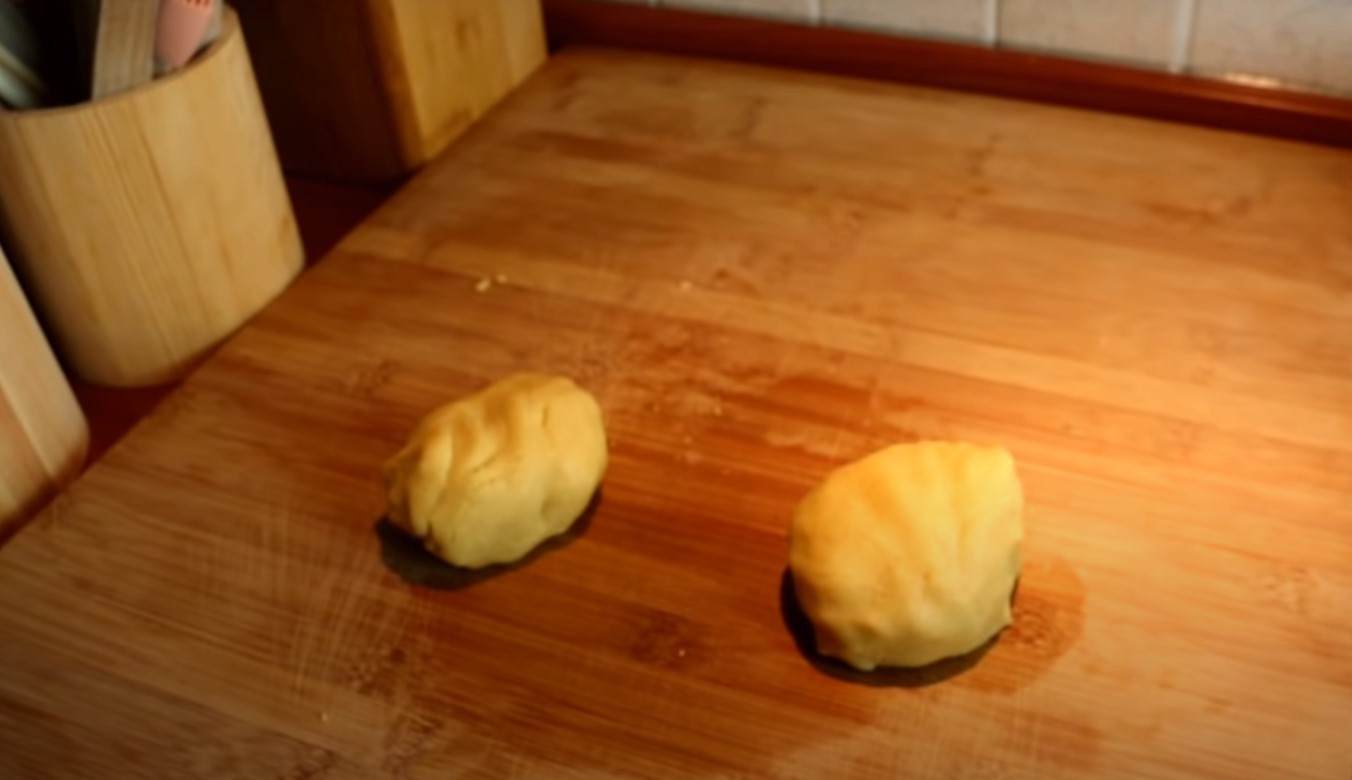 Mąkę wymieszać z proszkiem do pieczenia i wyrobić gładkie ciasto. Dzielimy je na dwie części.