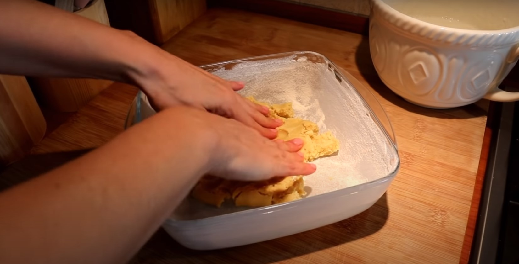 Formę smarujemy olejem i posypujemy mąką. Ciasto docisnąć równomiernie do dna.