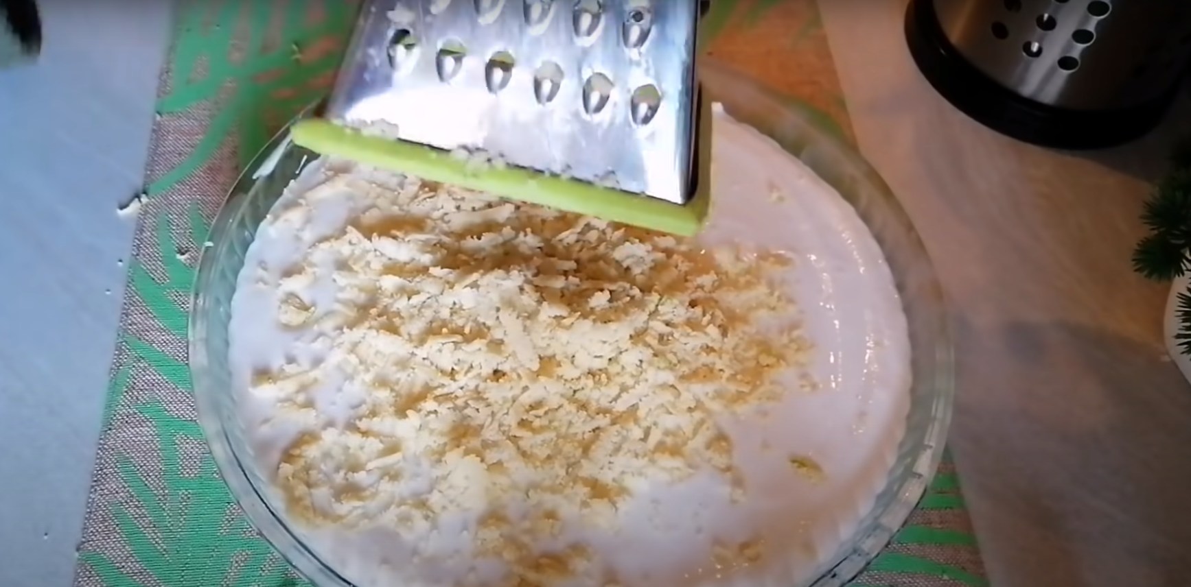 Masę rozłożyć w blaszce. Aby przykryć krem, połowę zamrożonego ciasta zetrzyj na tarce na wierzch. Piecz ciasto przez 30 minut w piekarniku nagrzanym do 180 stopni. Gotowe! Smacznego!