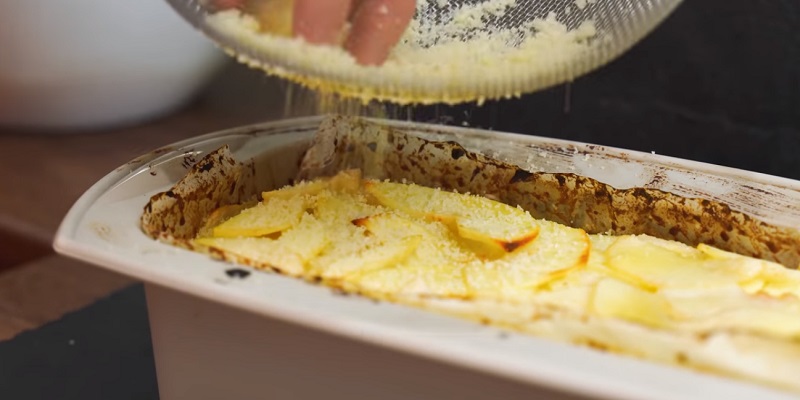 Plasterki owoców moczymy w cieście z każdej strony i układamy je w naczyniu warstwami. Potem zalewamy naczynie resztą ciasta. Ustawiamy piekarnik na 180 stopnie i pieczemy około pół godziny.
