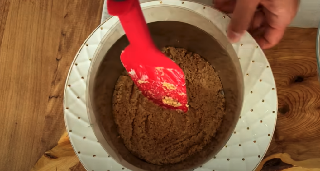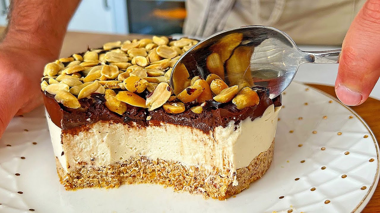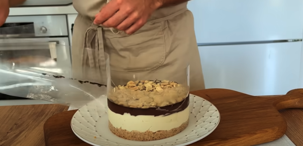 Jeśli masa jest zbyt gęsta, dodaj więcej mleka. Dodaj 2 łyżki rozpuszczonej żelatyny do masy czekoladowej i dobrze wymieszaj. Wyjmij schłodzoną podstawę z lodówki. Wylej na nią masę kremową, a następnie masę czekoladową. Posyp ciasto posiekanymi orzeszkami ziemnymi.