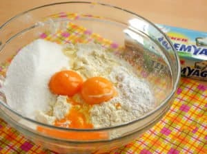 W pierwszej kolejności przygotowujemy ciasto. W tym celu 200 g przesianej mąki wsypujemy do miski, dodajemy masło, i ugniatamy rękami. Następnie dodajemy żółtka, cukier i proszek do pieczenia.
