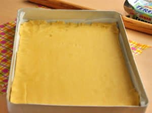 Blaszkę 25 x 30 cm (ewentualnie 20 x 30 cm) wykładamy papierem do pieczenia. Papier musi wystawać ponad krawędź blachy. Do wyłożonej blaszki przenosimy rozwałkowane ciasto (dobrym sposobem jest owinięcie go wokół wałka, a następnie odwinięcie wprost na papier).