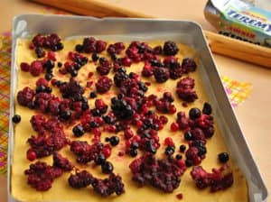 Można je lekko docisnąć, by mieć pewność, że przylega do podłoża. Surowe ciasto posypujemy mrożonymi owocami.
