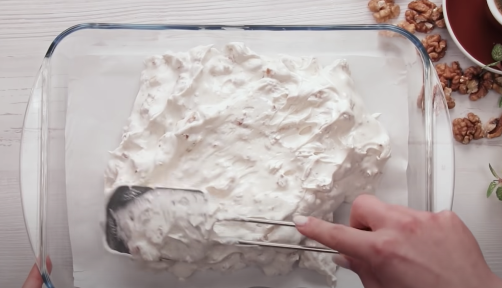 Następnie, białka ubijamy na sztywną pianę wraz z cukrem. Do masy dodajemy drobniutko pokrojone orzechy oraz mąkę i mieszamy. Do formy o wymiarach 22 na 28 cm wykładamy masę na biszkopty. Potem dajemy na całość orzechowy krem, a następnie znowu masę.