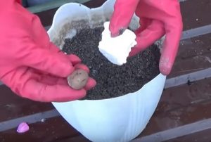 Weź doniczkę, połóż kawałek styropianu na dnie. Wypełnij go ziemią zmieszaną z piaskiem i popiołem drzewnym.