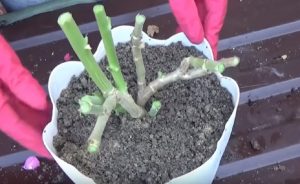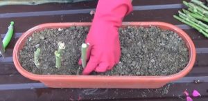 Przygotuj doniczkę, w której również ułóż kawałki styropianu na dnie. Wypełnij go ziemią zmieszaną z piaskiem i popiołem. Zrób małe otwory nożem i posadź w nich sadzonki na głębokość 4-5 cm. Dociśnij ziemię wokół nich, aby sadzonki były dobrze zamocowane. Umieść doniczkę na parapecie i podlej sadzonki w ciągu 1-2 dni, w zależności od tego, jak sucha jest gleba.