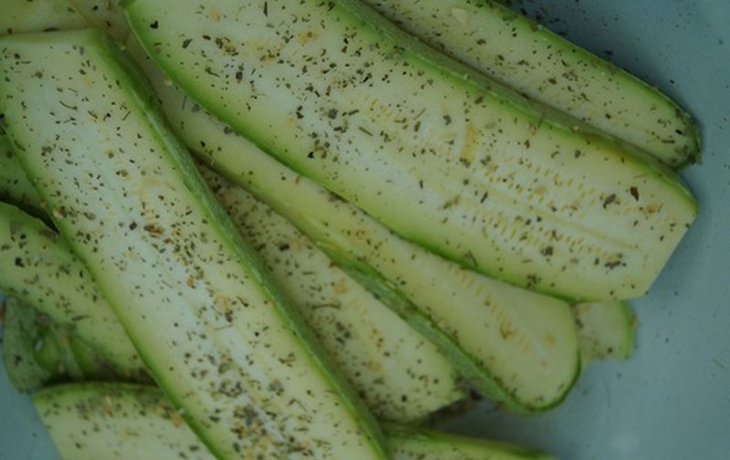 Cukinie dobrze umyj i pokrój na kawałki o grubości około 0,5 -1 cm. Plastry te należy umieścić w misce. Posól je, a następnie dodaj swoje ulubione przyprawy.