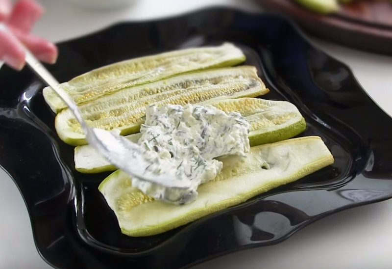 Kiedy cukinia będzie już upieczona, czas przygotować sos. Wymieszaj jogurt, posiekane zioła, rukolę i sól z przyprawami, czosnkiem i pieprzem. Gdy cukinia będzie już pokrojona w plastry, zacznij formować ciasto z wszystkich składników. Rozłóż cukinię na dużym talerzu. Następnie posmarować sosem i zetrzeć ser na tarce.