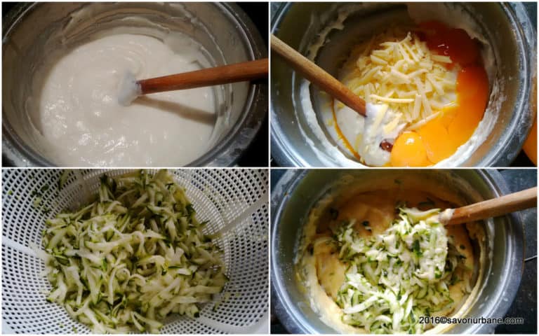 Wyłącz palnik i odstaw garnek, aby sos przestygnął przez ok 10-15 minut. Cukinię umyj i zetrzyj na tarce o średnich oczkach. Przełóż na sitko, aby odsączyć ją od nadmiaru wody. Włącz piekarnik i ustaw temperaturę na 200°C Do letniego sosu dodaj żółtka i 60 g startego sera.