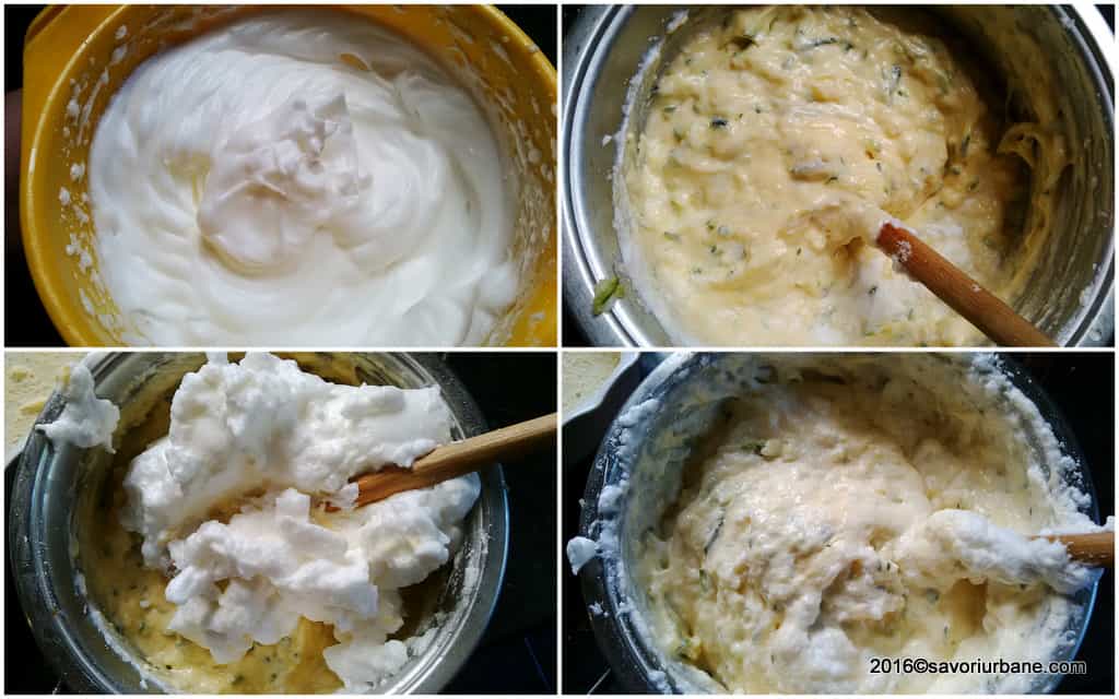 Cukinię odciskać w dłoniach i przełóż do powstałej masy. Dodaj biały pieprz do smaku. W osobnej misce ubij na sztywną pianę białka wraz z solą. Stopniowo przekładaj ją do masy z cukinii, mieszaj delikatnie, aby nadal była lekka i puszysta. Blaszkę wysmaruj masłem i wysyp bułką tartą.