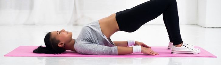 Połóż się na macie ze zgiętymi kolanami pod kątem 90 stopni. Napnij pośladki i unieś biodra do góry. Utrzymuj mostek przez minimum minutę nie zapominając o oddechu.