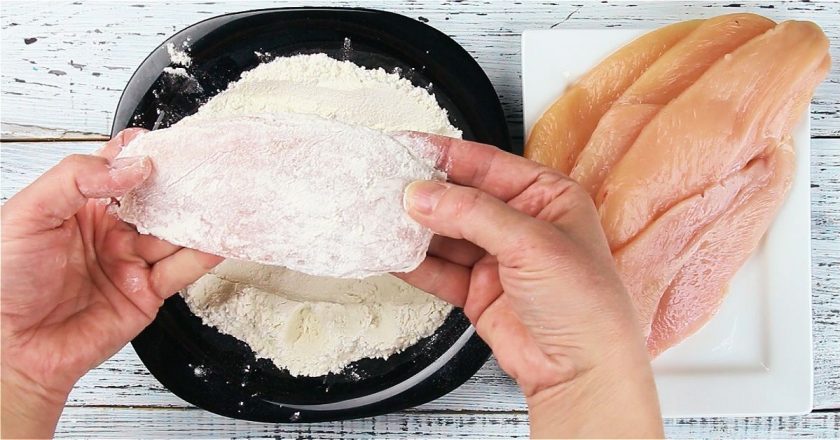 Piersi z kurczaka zamarynować w sodzie, a następnie oprószyć mąką ziemniaczaną. Możesz zacząć smażyć piersi z kurczaka, obtaczając je w zwykłej mące. Uzyskasz w ten sposób bardzo delikatny filet.
