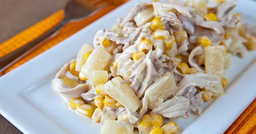 Sałatka, która łączy w sobie kurczaka i ananasa jest ulubionym daniem wielu osób. Trzymamy za nią kciuki! Dodaj pieczarki, serek śmietankowy, cebulę, czosnek i kukurydzę konserwową, aby przełamać intensywny smak ananasa. Wszystko wymieszaj z majonezem. Smacznego!