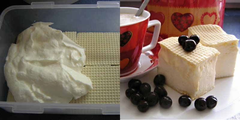 Gdy masa jest gotowa, możesz przystąpić do robienia lodów. Umieść jeden z wafli na dnie wybranego pojemnika. Rozprowadź na nim masę, a następnie przykryj kolejnym waflem.