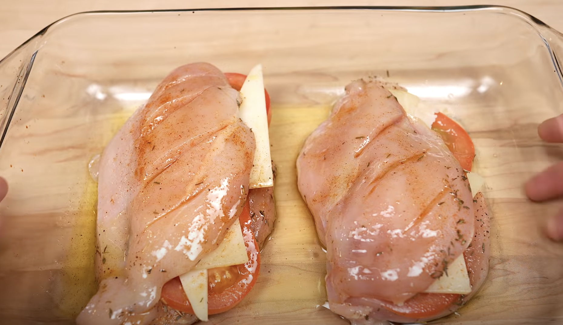 Posól potrawę i posmaruj ją sosem śmietanowym. Piecz danie przez 20-25 minut w piekarniku rozgrzanym do 200 stopni Celsjusza. Gdy piersi będą już upieczone, dodaj na wierzch plasterek sera i zapiekaj jeszcze przez 2-5 minut. Po upływie tego czasu ciesz się prostym przepisem.
