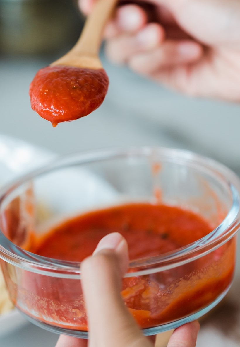 Do miski wlać sos pomidorowy, dodać pozostałe 2 ząbki zmiażdżonego czosnku, posolić, doprawić, wymieszać i wlać każde gniazdo bakłażana.