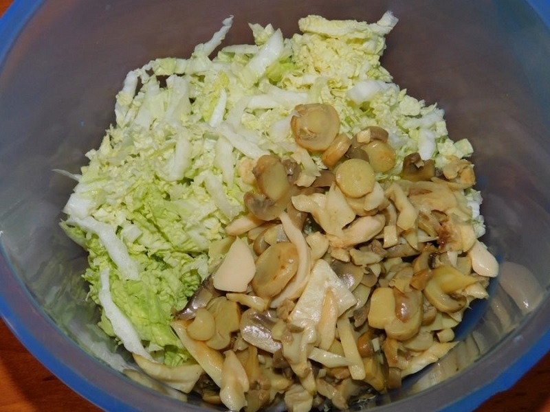 Podudzia kurczaka należy upiec w ulubionych przyprawach, aż będą miękkie. Pokrój mięso na duże kawałki. Grzyby pokroić na małe kawałki. Wymieszaj grzyby z oliwą z oliwek. Smażyć na złoty kolor. Kapustę posiekać, a pomidory pokroić. Wymieszaj musztardę z jogurtem. Połączyć musztardę z jogurtem. Posypać posiekanymi orzechami. Podawać. Smacznego