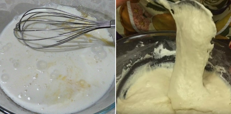 Dokładnie zmieszaj kefir, cukier, sól, sodę, olej i mąkę. Ciasto jest gotowe, gdy powstała masa jest dość gęsta. Jej konsystencja powinna być bardziej zwarta niż ciasto na naleśniki, ale nie na tyle, by możliwe było ugniatanie ciasta.