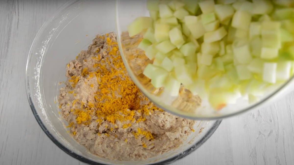 Jabłka umyj, obierz i usuń gniazda nasienne. Pokrój je w drobną kostkę. Cytrynę sparz wrzącą wodą i zetrzyj skórkę wprost do miski z przygotowanym ciastem. Sokiem skrop pokrojone jabłka i delikatnie przełóż je do mieszanki. Wszystko dobrze wymieszaj.