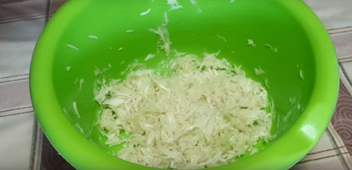 Połowę główki kapusty posiekaj (powinno być 400 g). Kapustę włóż do większej miski. Cebulę zetrzyj na grubych oczkach na tarce i dodaj do miski z kapustą. Oba składniki wymieszaj ze sobą.