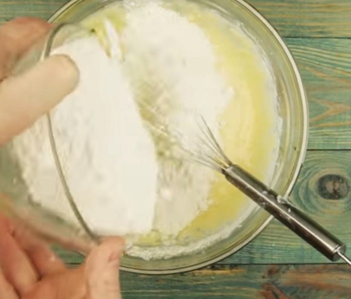 Ubij jajka z cukrem w dużej misce. Do ubitych jaj, dodaj dżem, kefir, sodę oraz mąkę. Wymieszaj ciasto tak, aby konsystencja była dość lejąca i swobodnie kapała z łyżki za pomocą trzepaczki.