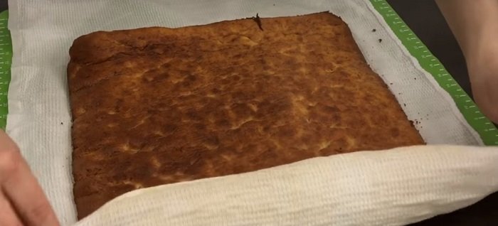 Gdy ciasto będzie upieczone, wyjmij je z piekarnika i odstaw do ostygnięcia. Pokrój ciasto tak, aby uzyskać z niego 4 placki.