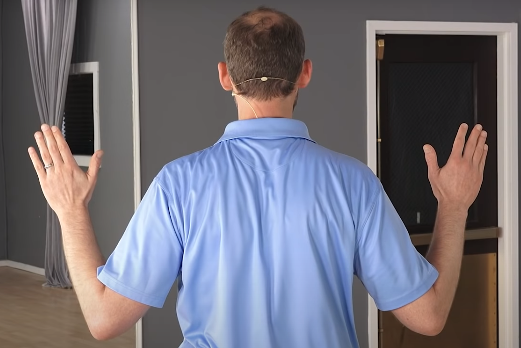Utrzymujemy równowagę. Ręce ustawiamy w literę „W”. Wykonując ten ruch jednocześnie odpychasz łokcie do tyłu i w dół. Trzymaj łokcie w dole, a głowę z tyłu. Powinieneś poczuć skurcz w plecach. Pozostań w tej pozycji przez około pięć sekund. Ćwiczenie to można powtórzyć pięć razy.