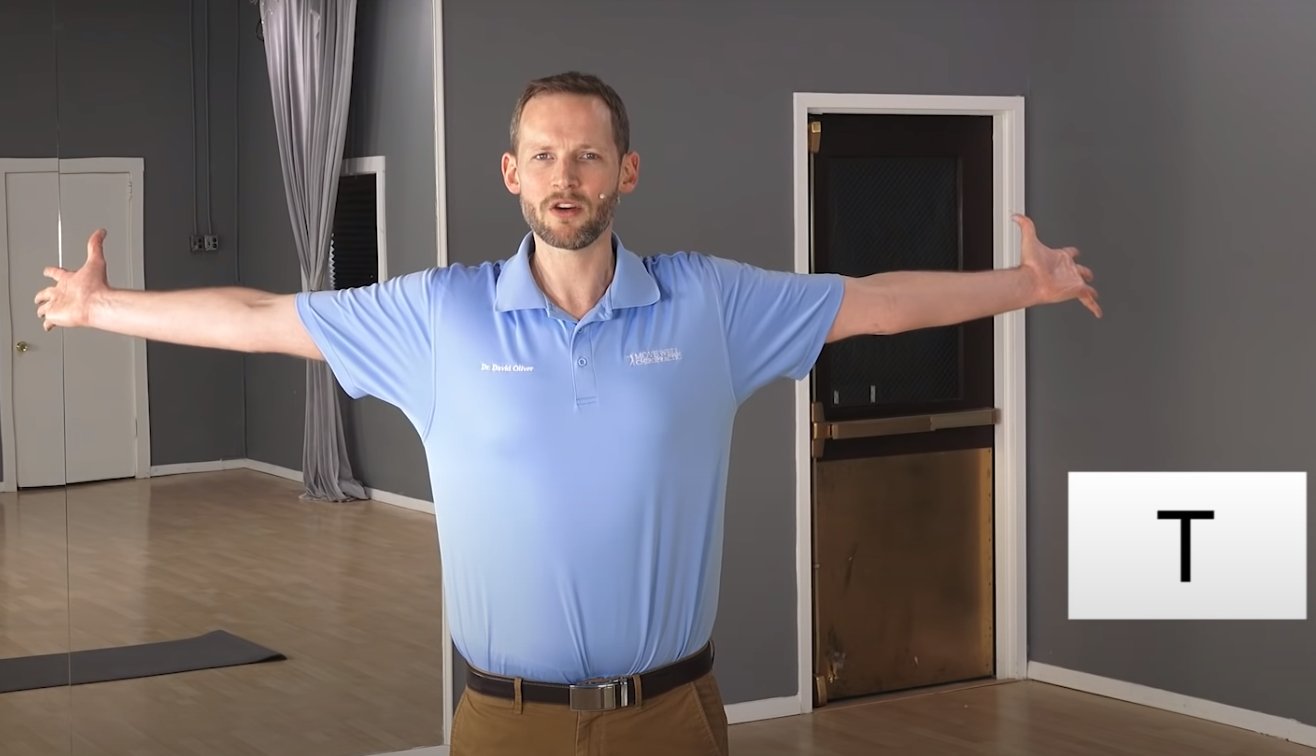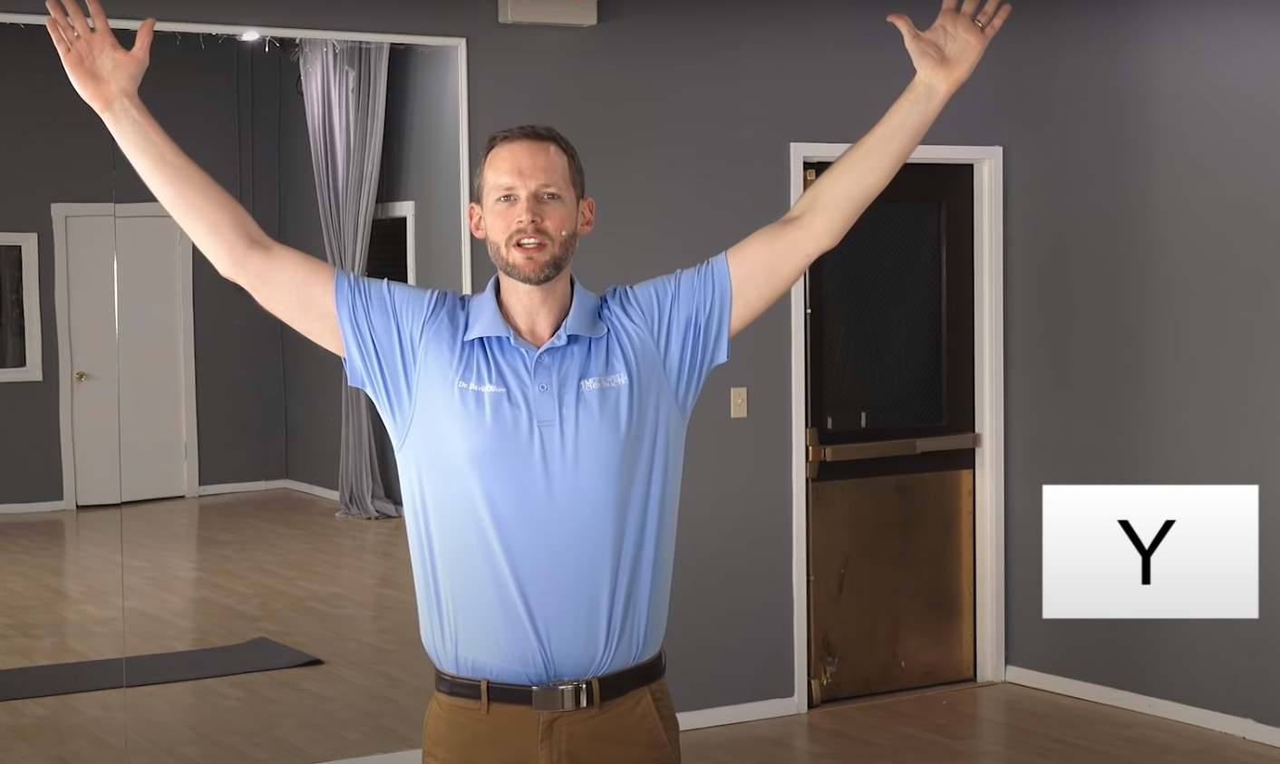 Plecy trzymamy prosto. Podnieś ramiona do góry tak, aby Twoje ciało utworzyło literę „Y”. Nie podnoś rąk i nie wystawiaj głowy. Trzymaj ręce w pozycji „Y”. Odsuń ramiona do tyłu tak daleko, jak to możliwe, ale wygodnie. Utrzymaj tę pozycję przez dwa głębokie oddechy.