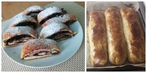 Z cukru i wody zrobimy syrop cukrowy (na nitkę). Wmieszaj gorący syrop do maku i dodaj 1 dcl rumu i około 3 paski skórki z cytryny. Nadzienie orzechowe: Wymieszaj gorący syrop cukrowy i około 3 paski skórki pomarańczowej z orzechami.