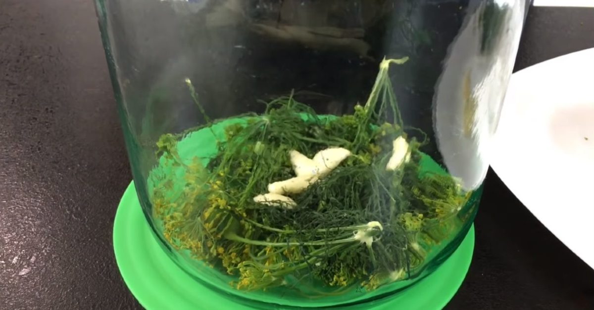 Obierz czosnek lub przepołów, jeśli masz duże ząbki, a następnie włóż czosnek na dno słoika razem z koperkiem. Koperek będzie jeszcze potrzebny, więc nie wkładaj go zbyt dużo na dno.