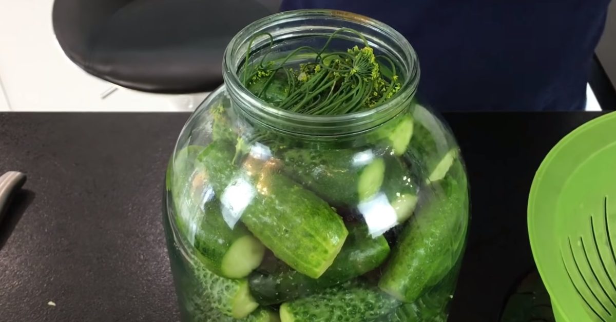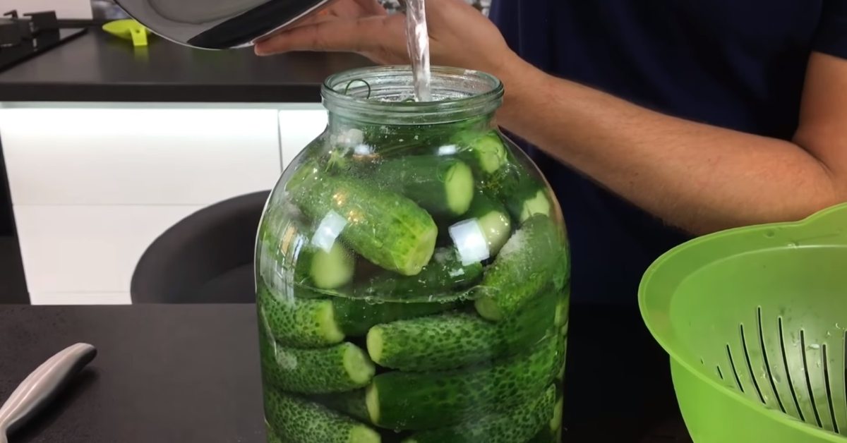 Wrzuć ogórki do wrzącej wody. Zamknij słoik i delikatnie przechylaj pokrywkę, aby rozprowadzić sól.
