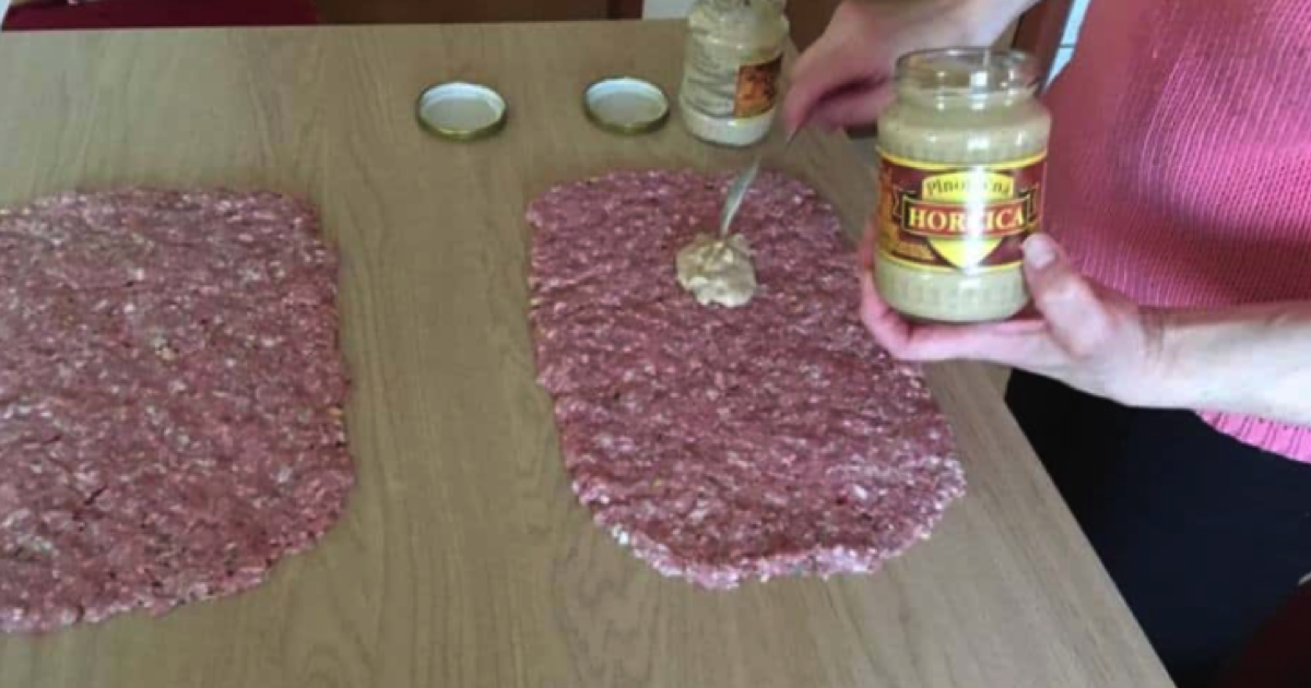 Następnego dnia podziel mięso na dwie równe porcje. Z mięsa uformować prostokątne placki. Posypać je keczupem, musztardą lub serem. Starannie zwinąć.