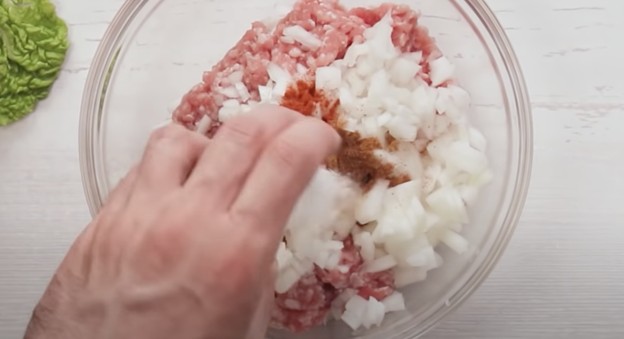 Przygotować składniki nadzienia. Mięso mielone połączyć z drobno posiekaną cebulą. Doprawić solą i pieprzem.