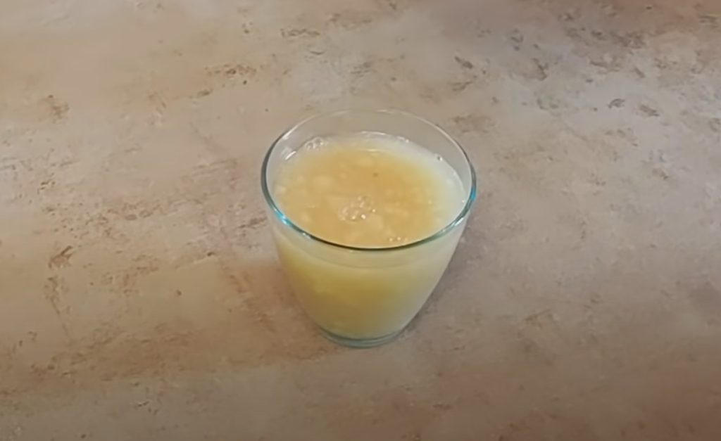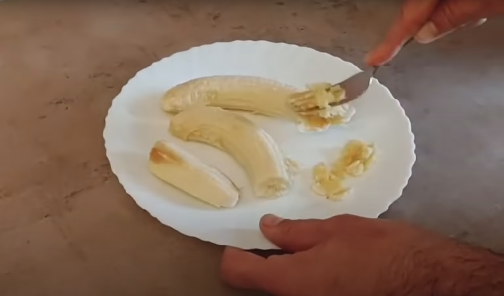 Dwa obrane banany rozgnieść widelcem do uzyskania gładkiej masy.