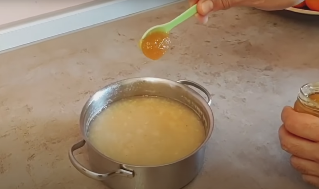 Wmieszaj 2 łyżki stołowe miodu do ciepłej mieszanki. Dobrze wymieszaj, aż miód całkowicie się rozpuści.
