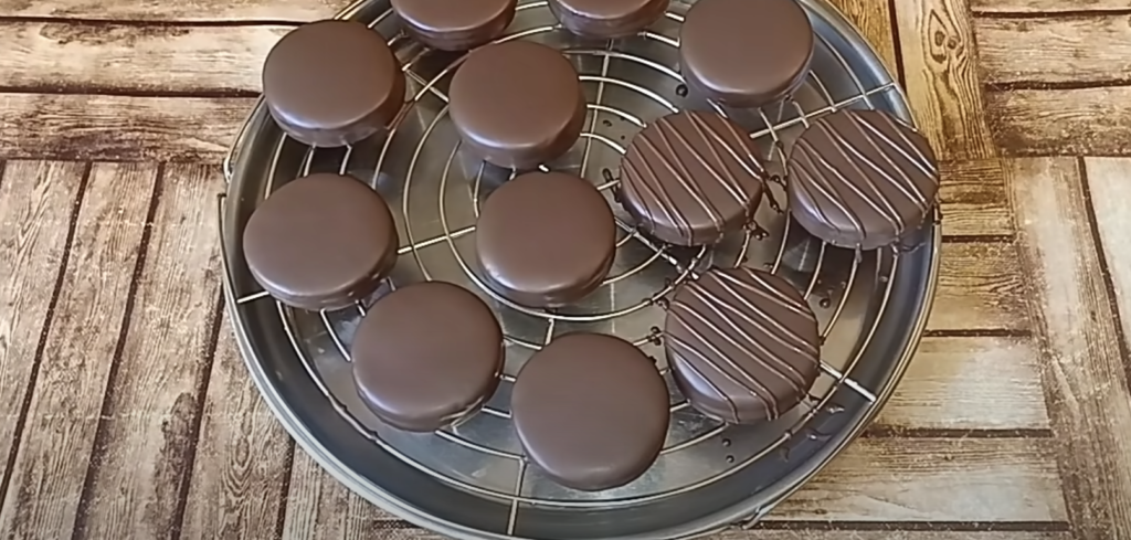 Polewę można dodać na końcu. Ciemną czekoladę należy roztopić na małym ogniu. Piec ciastka w piekarniku przez 10 minut. Nałożyć nadzienie na ciastka. Nie zostawiaj masy do zastygnięcia zbyt długo. Gotowe! Na koniec, możesz udekorować ciastka jak tylko chcesz.