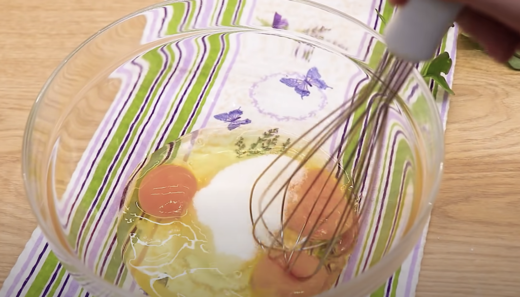 Jajka wymieszać trzepaczką z cukrem i z cukrem waniliowym.
