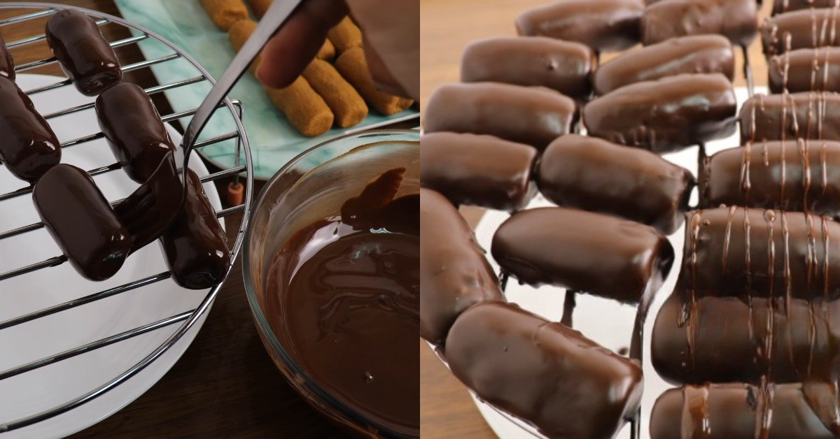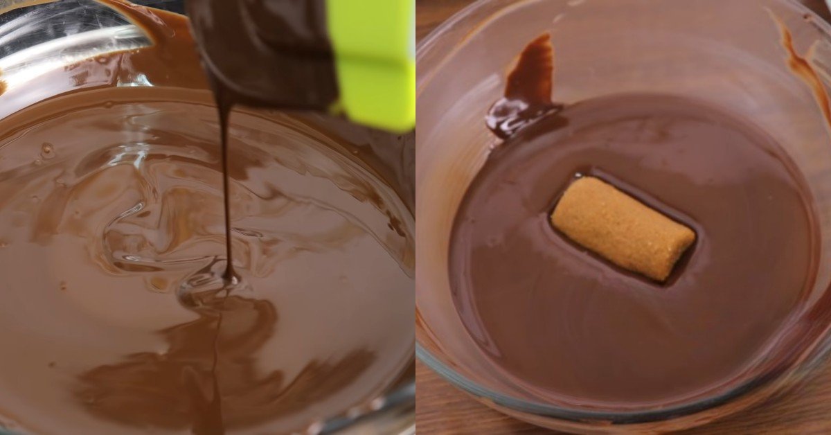 Każde ciasteczko umieść na blaszce wyłożonej papierem do pieczenia. Możesz także wykorzystać duży talerz lub inne płaskie naczynie. Ważne jest aby pomiędzy ciasteczkami zachować odstęp, dzięki czemu nie skleją się ze sobą. Przygotuj kąpiel wodną a następnie rozpuść w niej połamaną na mniejsze części czekoladę.