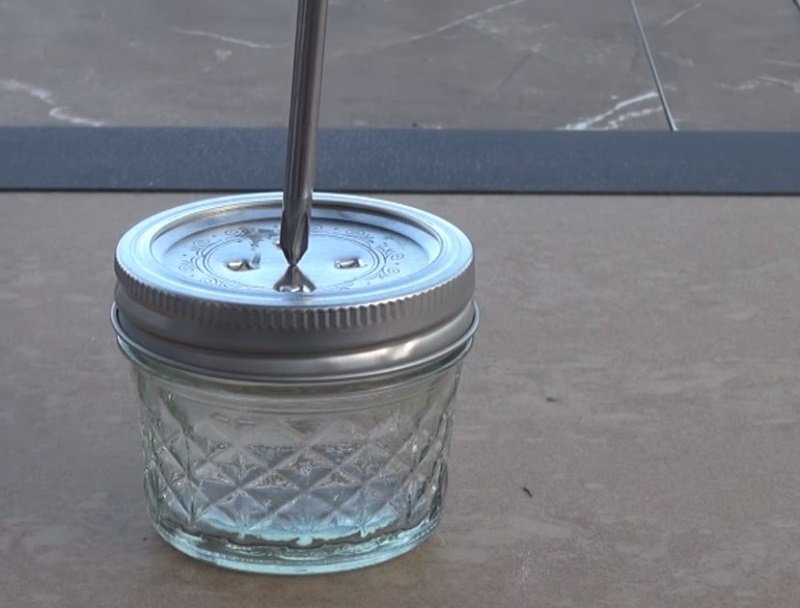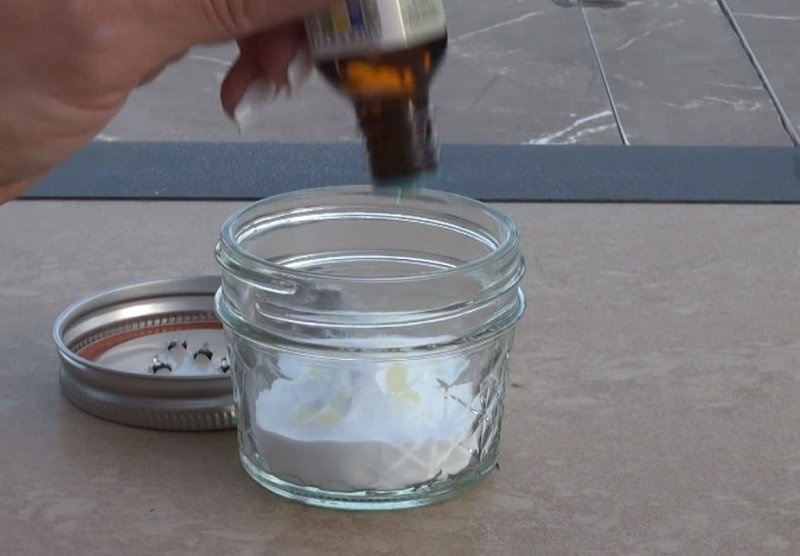 Słoik zakręć szczelnie lub przykryj kawałkiem folii spożywczej. Wstrząśnij zawartość, aby wymieszać sodę z olejkami. W pokrywie wykonaj dziurki. Możesz je zrobić za pomocą wiertarki lub młotka i gwoździ.