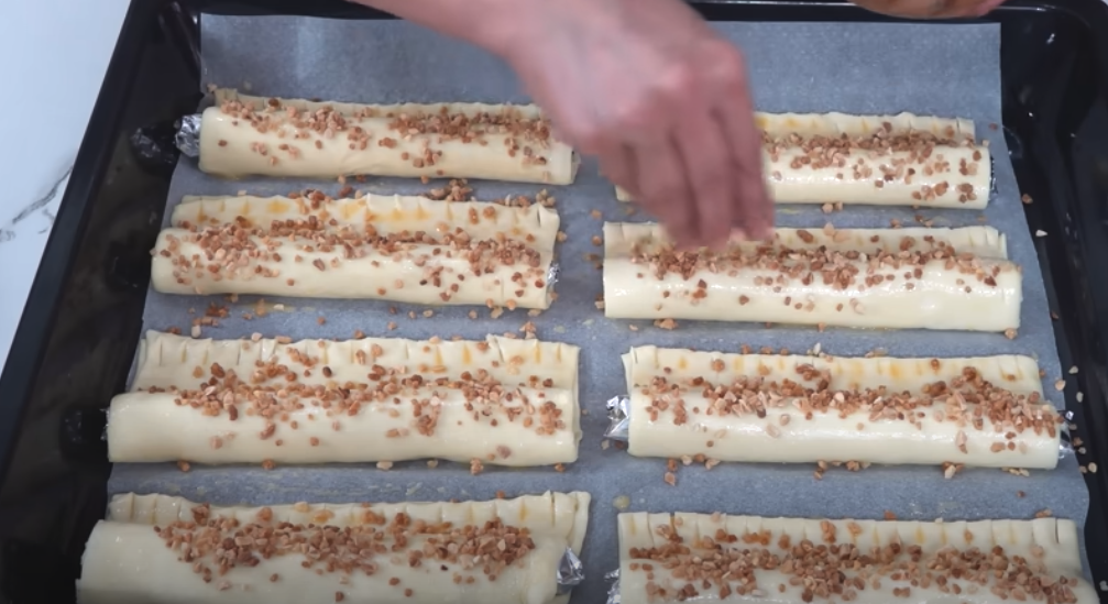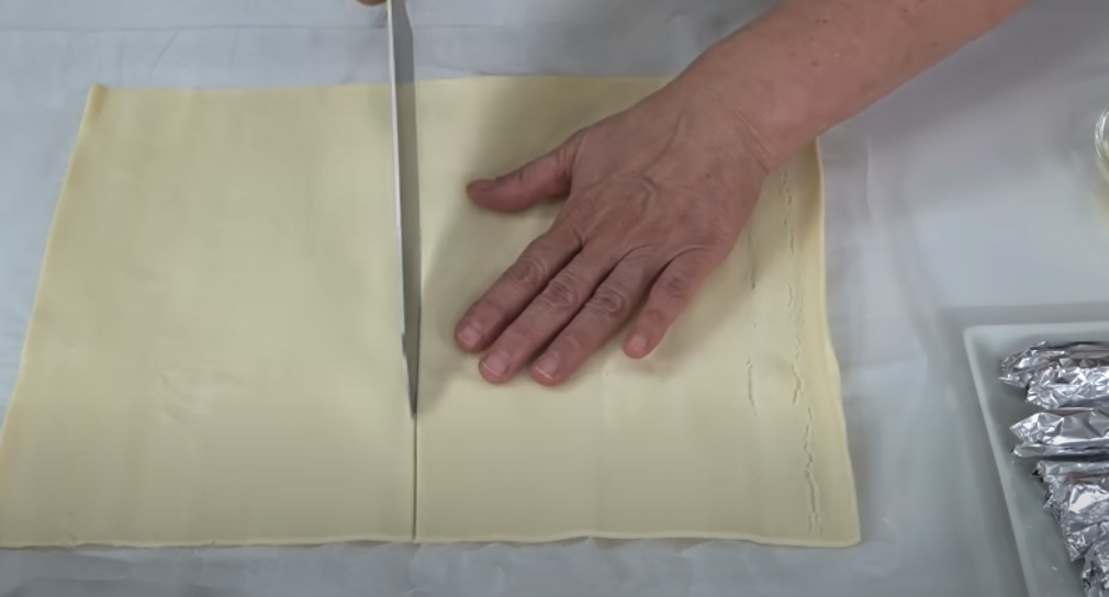 Po zgęstnieniu kremu, odstaw go do ostygnięcia. Rozwałkuj ciasto francuskie i lekko rozciągnij wałkiem. Pokrój ciasto na prostokąty. Posmaruj środek każdego prostokąta roztopionym masłem, a krawędzie białkiem jaja. Na każdym prostokącie ułóż rurkę z folii aluminiowej, złóż ciasto na pół, tak aby dłuższe krawędzie się skleiły. Ułóż pałeczki na blasze wyłożonej papierem do pieczenia.