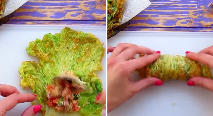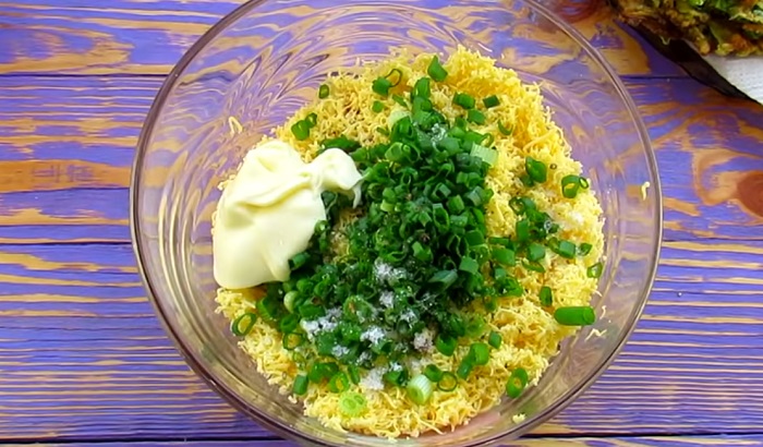 Kiedy liście są już gotowe, połóż je na talerzu przykrytym papierowym ręcznikiem. Pomoże to odsączyć nadmiar tłuszczu. Pokrój pomidory i szynkę na małe kawałki. Następnie zetrzeć ser na tarce o małych oczkach. Dodaj szczypiorek, sól i pieprz do smaku.