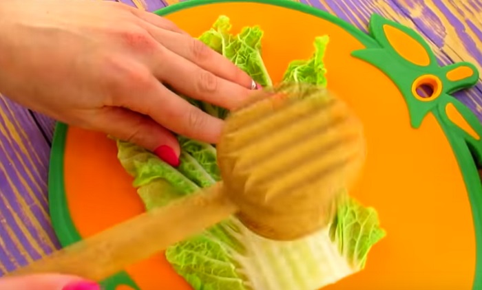 Wymieszaj majonez z nadzieniem. Łyżką nałóż odrobinę nadzienia na brzegi każdego liścia. Następnie zwiń go w rulon. Najlepiej robić to na gładkiej, równej powierzchni.
